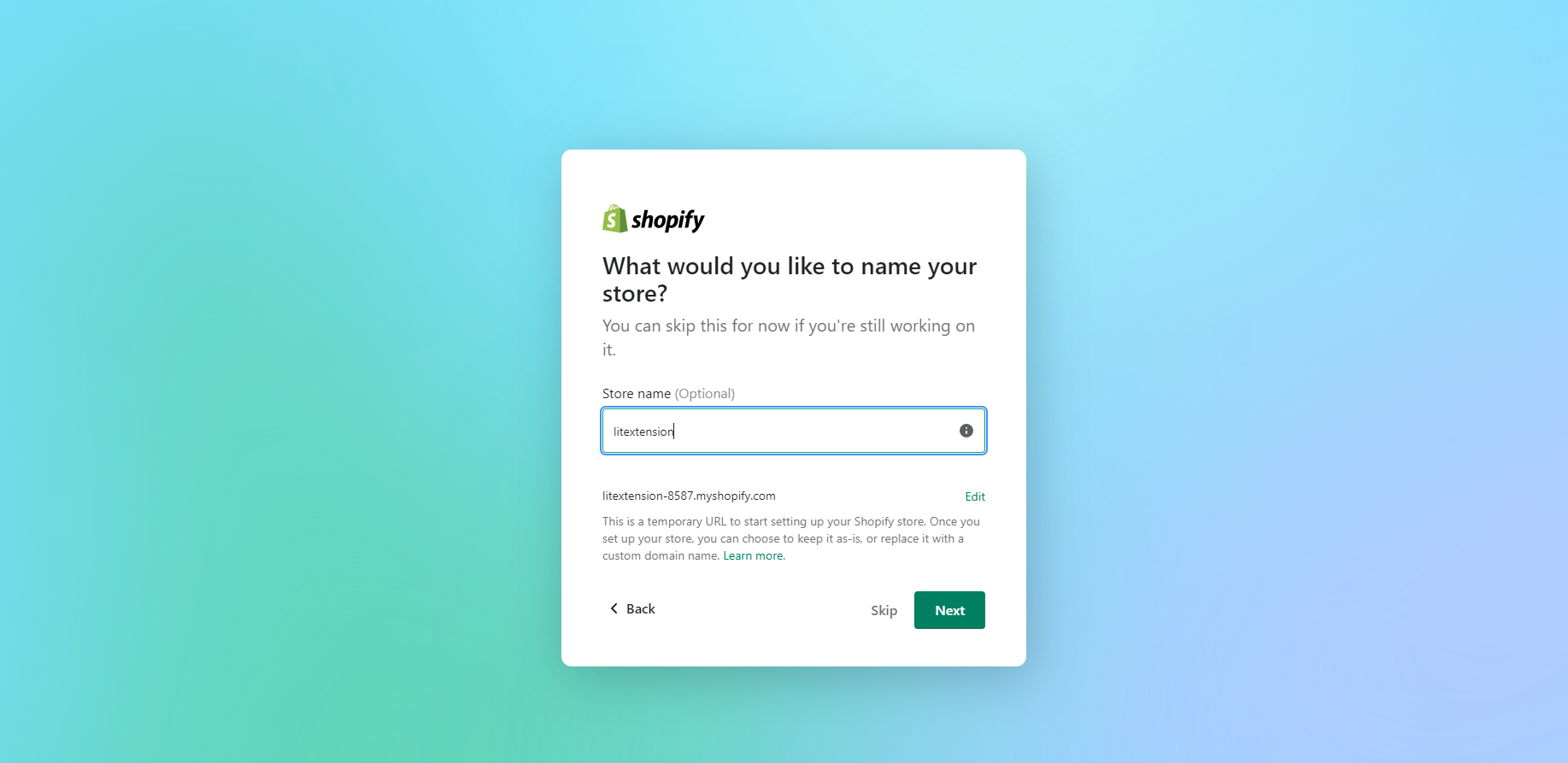 - ステップ 3: Shopify からの質問に回答し、ストアの名前を入力します