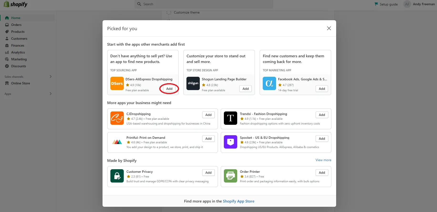 あなたがドロップシッパーであるが、販売する製品がない場合はどうなりますか? 問題ありません。 Shopify ドロップシッピング製品を見つけることができます。 「設定ガイド」セクションで、「販売する製品を探す」をクリックすると、Shopify アプリ ストアのトップのドロップシッピング アプリにアクセスできます。 特に、Dsers や Spocket などの一部のアプリは、潜在的なサプライヤーを見つけて、その製品を Shopify ストアにインポートして販売するのに役立ちます。
