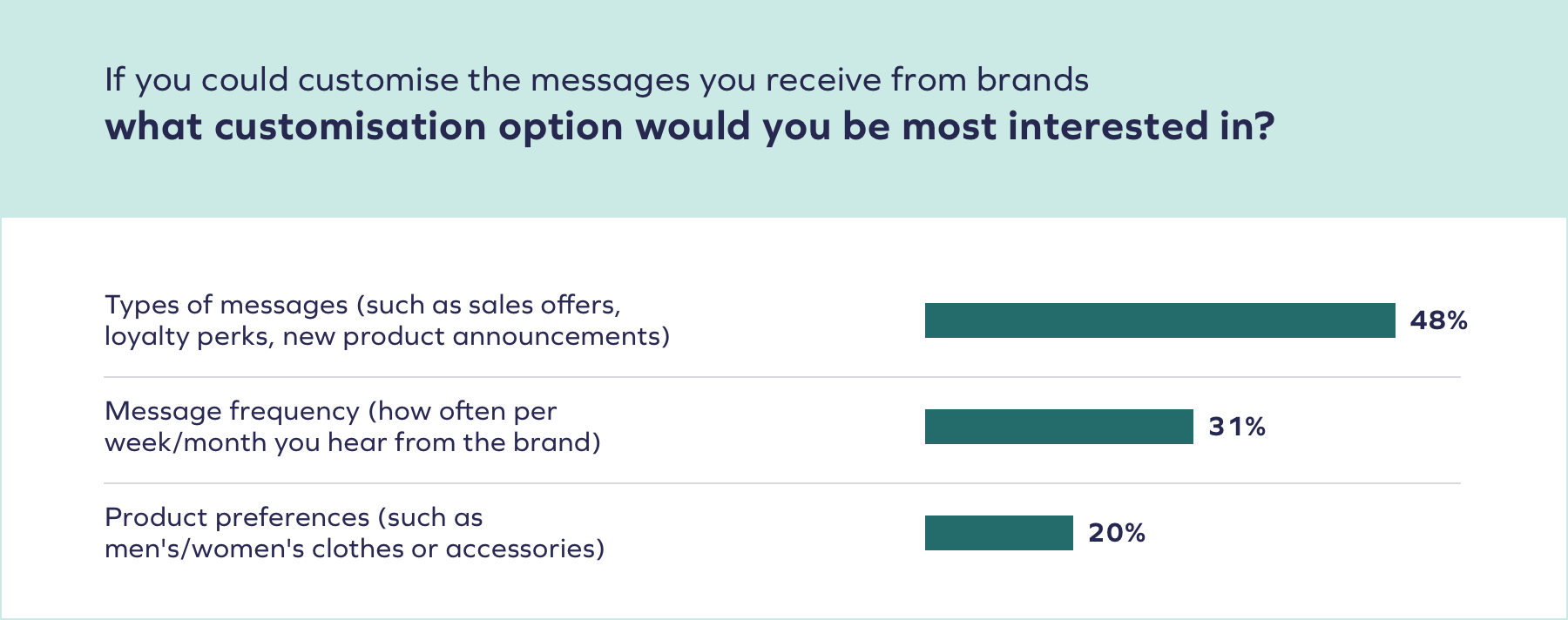 買い物客は、オプトインするとテキストメッセージを自分で制御できることに関心を示しました。最も関心のあるカスタマイズオプションについて尋ねられたとき、買い物客の48%は、受信するメッセージの種類(販売オファーなど)を選択したいと考えていました。 、ロイヤルティ特典、新製品の発表)、 31%はメッセージの頻度を管理したいと考えていました。