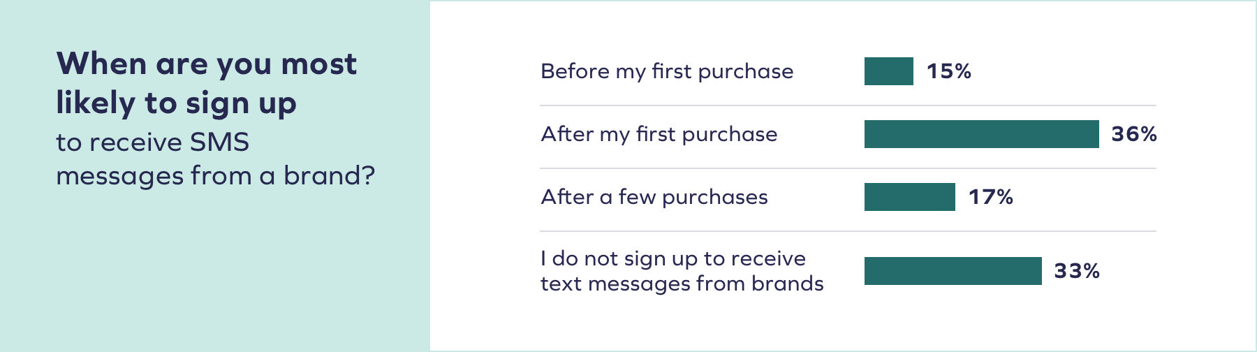 英国の買い物客の67%以上が、旅行中にSMSメッセージを受信するためにサインアップする可能性がありましたが、ほとんどの買い物客は最初にブランドを知りたいと思っています。 いつサインアップするかを尋ねられたとき52%以上が、最初の購入、または数回の購入後にサインアップすると答えました。
