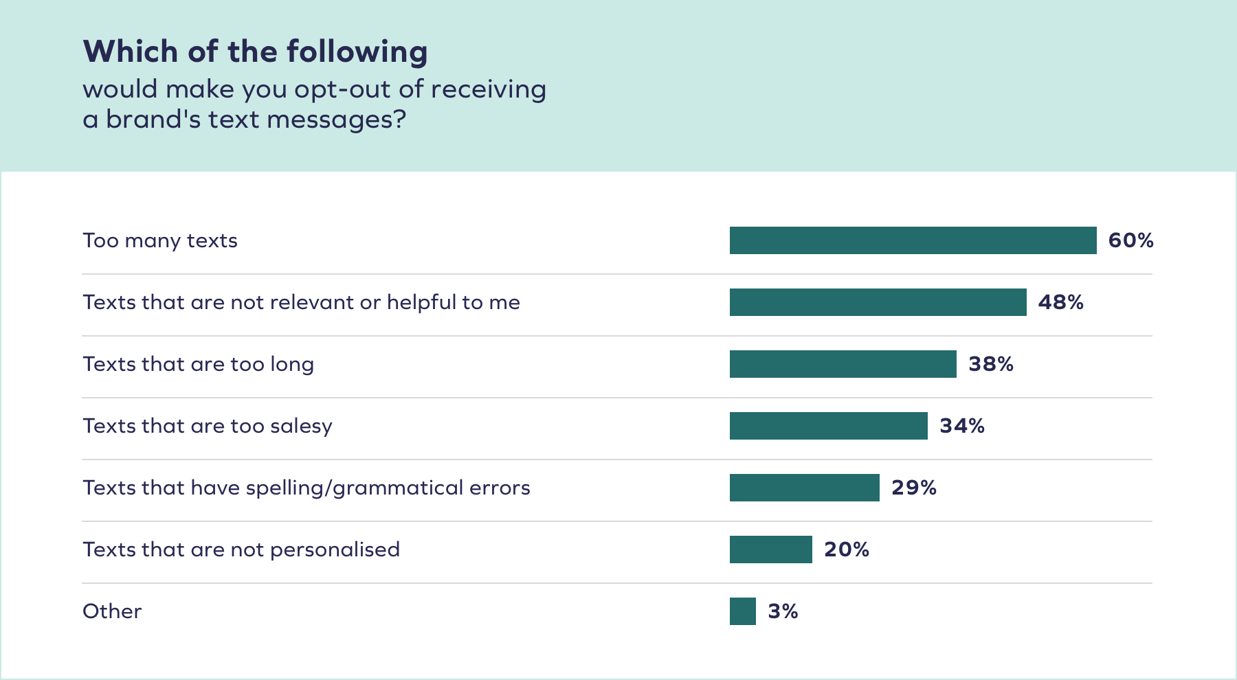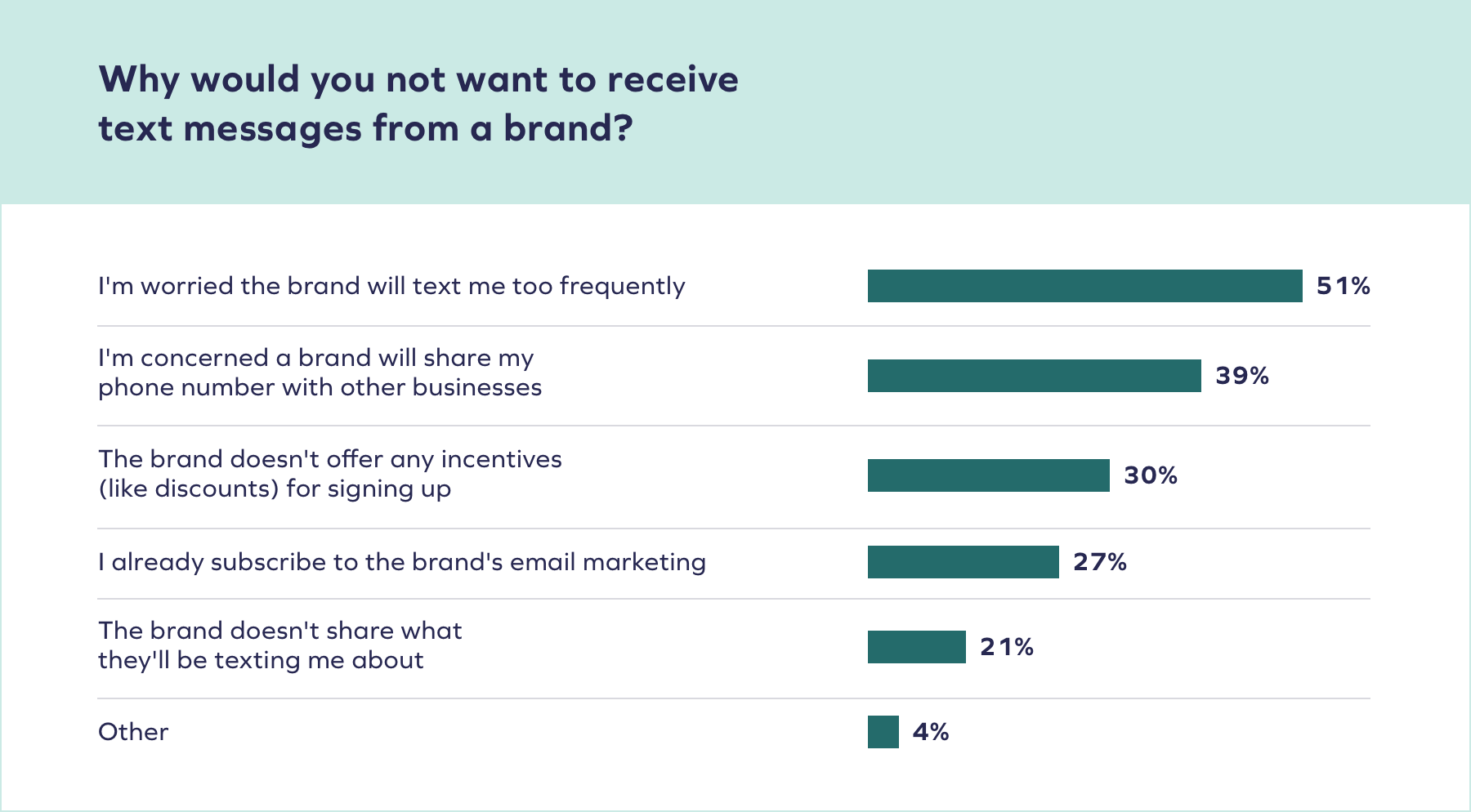 確かにそうです。 買い物客は、ブランドからのテキストメッセージの頻度が高すぎる(51%)か、電話番号がサードパーティと共有される(39 はないかと心配しています その他の回答には、「無関係なテキスト」や「スパムに興味がない」などが含まれていました。