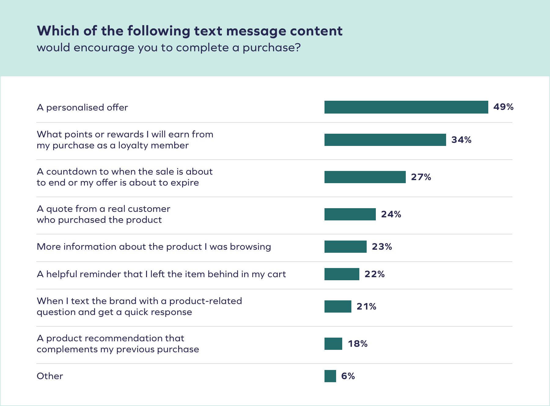 買い物客は、他の人と同じメッセージを受け取りたくありません。 買い物の習慣と同様に、すべての顧客はユニークであり、彼らはブランドがパーソナライズされ、関連性があり、彼らに排他的なメッセージでこの個性に応えることを望んでいます。 どのコンテンツが彼らの注意を引くのに最も適しているかを見つけるために、私たちは彼らにテキストメッセージを最も魅力的にするものを尋ねました。