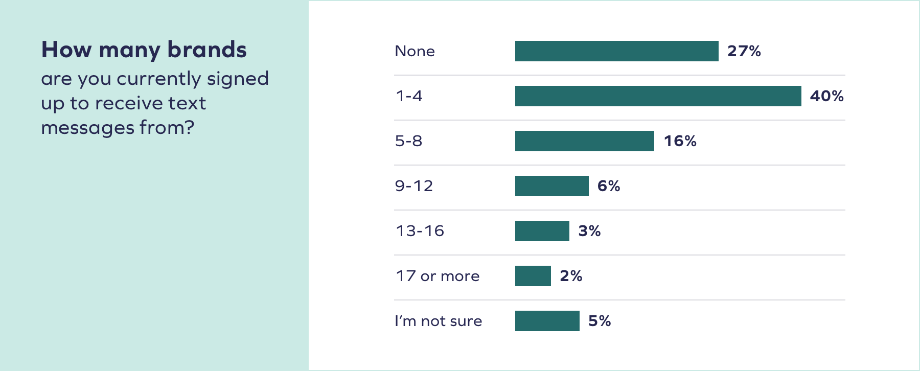 すでにテキストを受け取っている買い物客の72%は、ほとんどの場合、限られた数のブランドを購読しています。40%は、1〜4のブランドにしか登録していないのに対し、 16%は5〜8のブランドに登録していると答えています。 9〜12のブランドに登録しているのはわずか6%です。