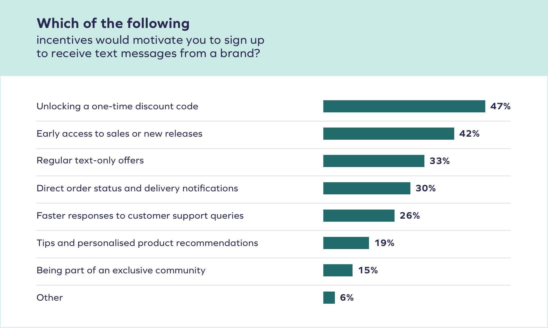どのインセンティブが彼らにオプトインする動機を与えるかについて具体的に尋ねられたとき、その1回限りの割引コードのロックを解除することが最も一般的な答えでした( 47% )。 買い物客はまた、販売または新しいリリースへの早期アクセス( 42% )、および直接注文ステータスと配達通知( 30% )を取得するという見通しに動機付けられました。
