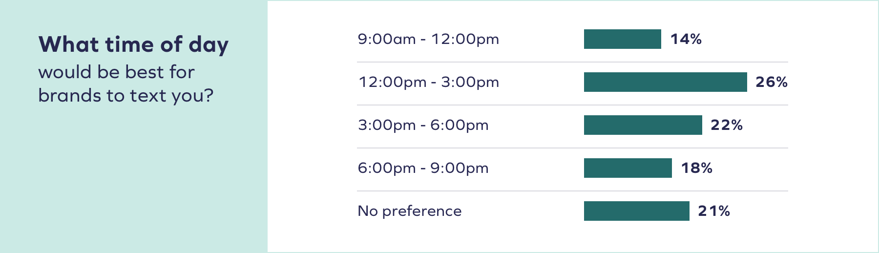 適切なメッセージを顧客に送信することだけでなく、適切なタイミングでメッセージを送信することも重要です。 買い物客に、ブランドがテキストを送信するのに最適な時間帯を尋ねました。これにより、テキストはいつでも歓迎され、煩わしくなりません。