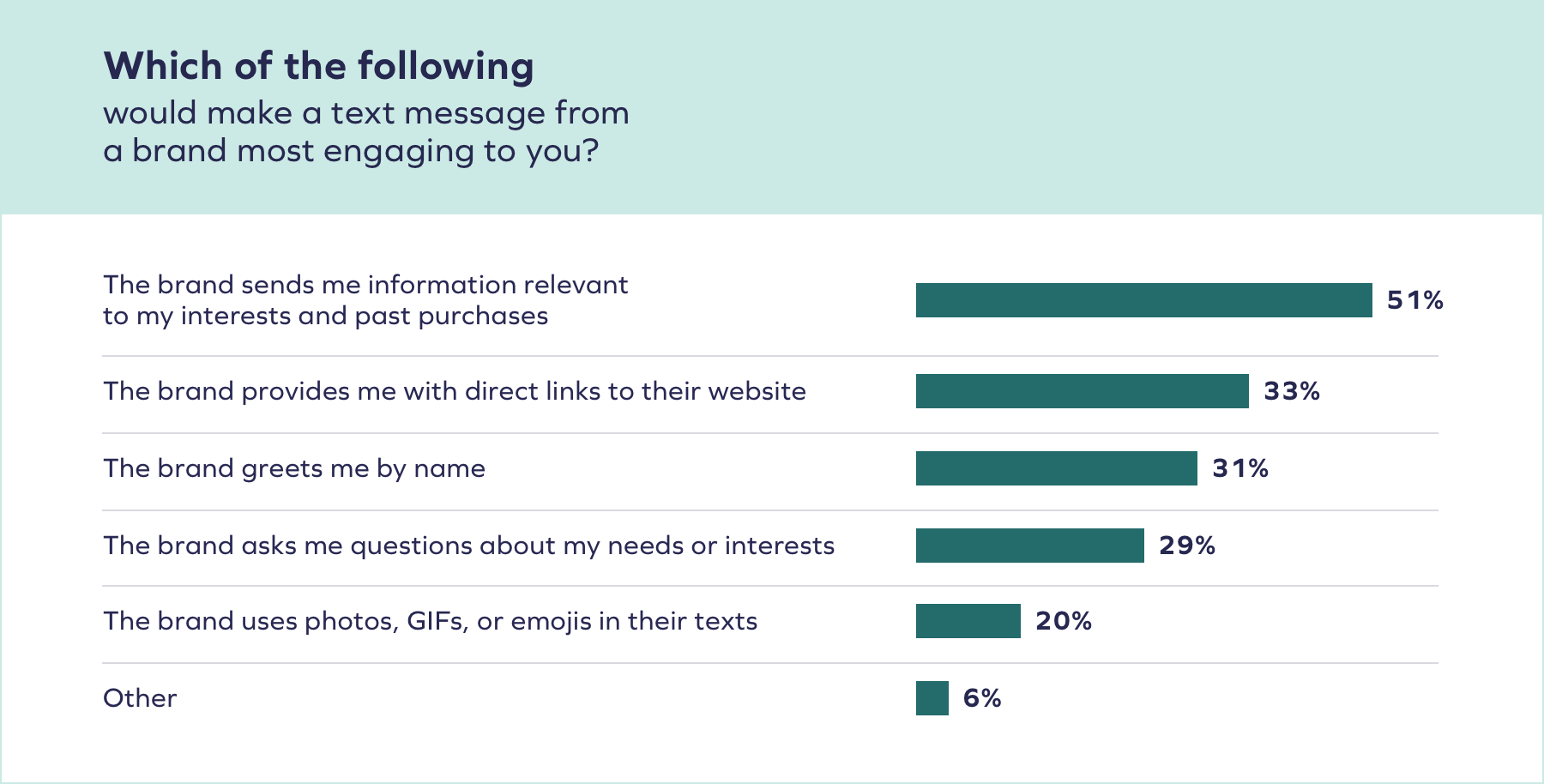 50%以上が、ブランドが彼らの興味や過去の購入に関連する情報を送信するときに、テキストメッセージが最も魅力的であると述べています。 ほぼ33%が、ブランドが自社のWebサイトへの直接リンクを含めることを好みます。そのため、検索しなくても便利にクリックでき、 31%は名前で迎えられたいと考えています。