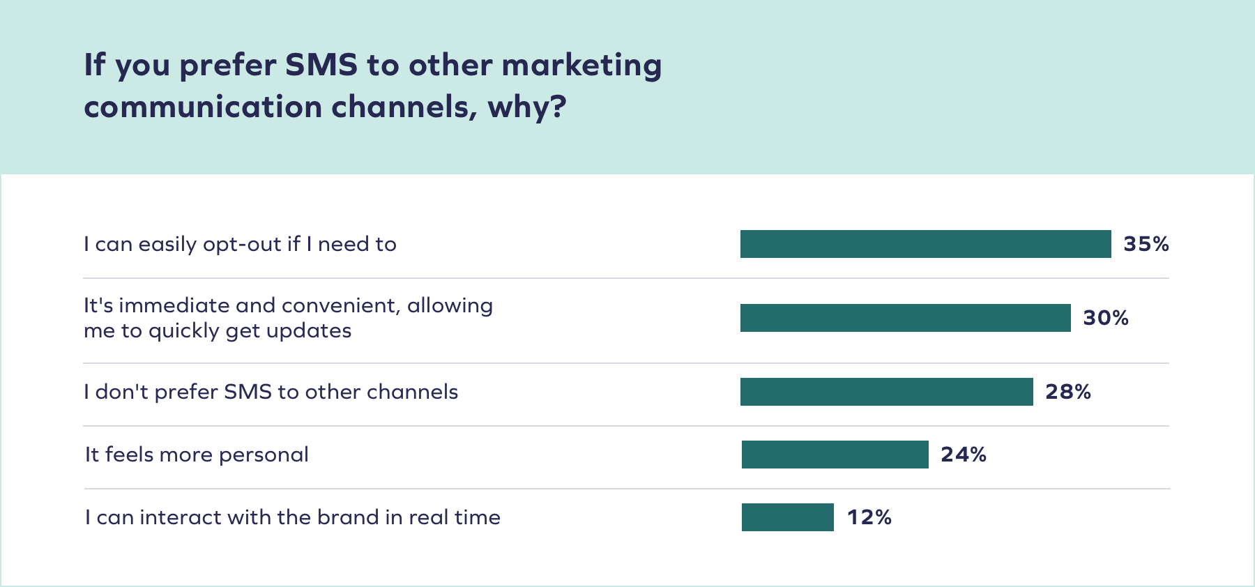 また、他のマーケティングコミュニケーションチャネルよりもSMSを好む理由尋ねたところ、結果は同様でした。30%が、テキストメッセージングを好むと答えました。これは、テキストメッセージングが迅速で便利であり、最新情報をすばやく入手できるためです。