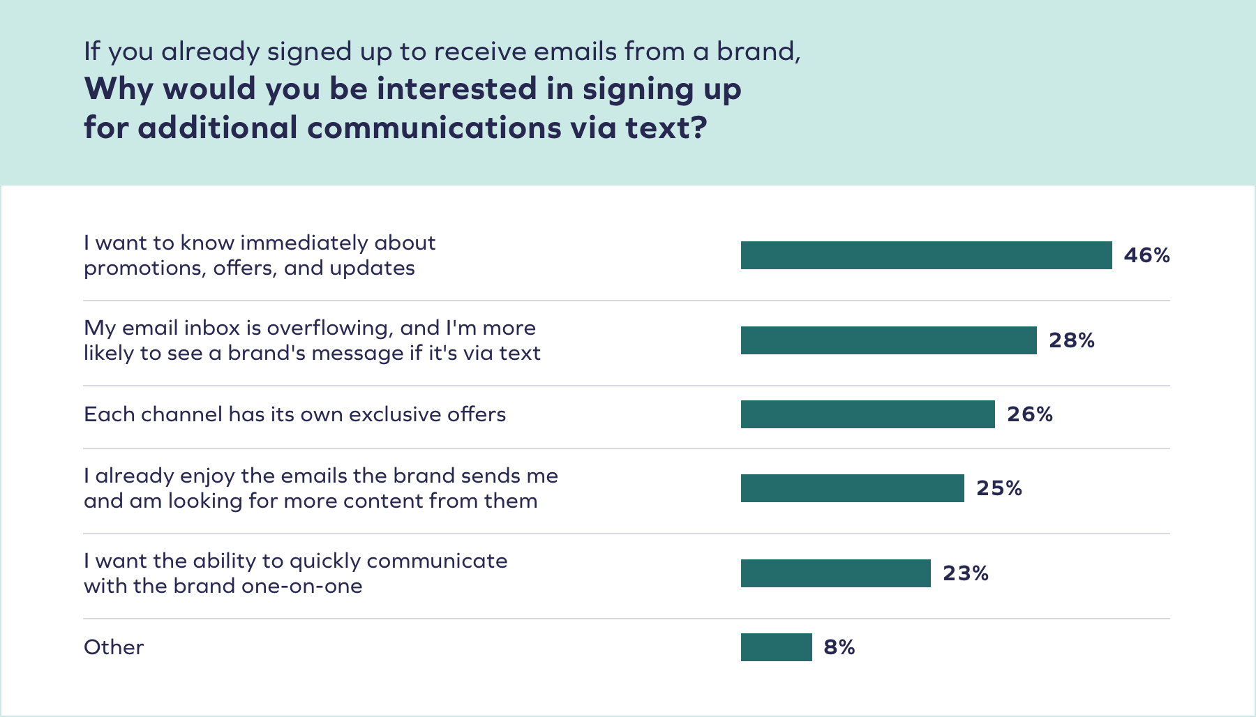 買い物客の46%以上、プロモーション、オファー、アップデートについてすぐに知りたいので、SMSメッセージにもサインアップすると答えました さらに、 28%がメールの受信トレイが溢れていると答えたため、テキスト経由の場合はブランドのメッセージが表示される可能性が高くなります 26%以上が各チャネルに独自の限定オファーがある場合は、サインアップする価値があると述べています。