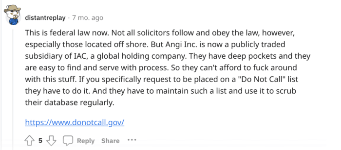Angi または HomeAdvisor から電話がかかってきたら、電話リストからあなたの番号を削除するよう担当者に丁寧に依頼してください。 後で参照できるように、代表者の名前とリクエストの日付を必ずメモしてください。 リクエストの処理には時間がかかる場合があるため、その間も電話を受ける可能性があることに注意してください。