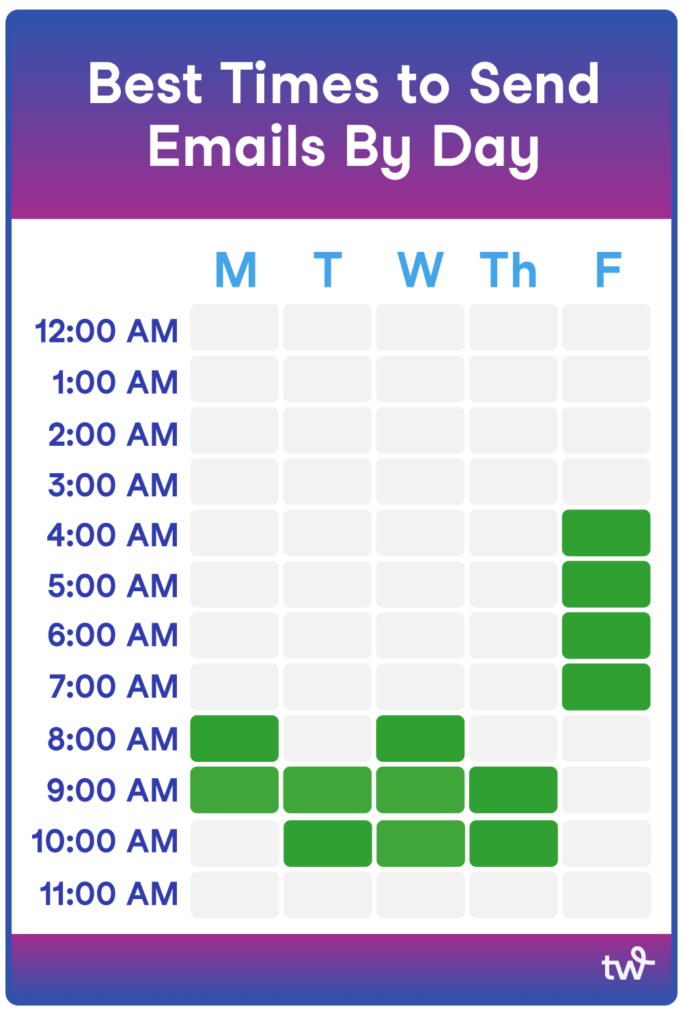 一方、Wordstreamのデータによると、メールを送信するのに最適な日は実際には木曜日であり、火曜日と水曜日の朝がメールを送信するのに最悪の日時です。