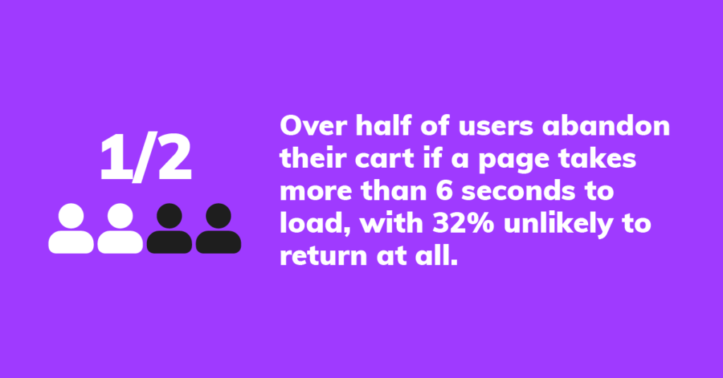 さらに、電子商取引 Web サイトは非常に複雑な場合が多いため、読み込みが遅く、ナビゲートが非常に難しく、顧客エクスペリエンスが低下することがよくあります。 ページの読み込みに 6 秒以上かかると、半数以上のユーザーがカートを放棄し、32% はまったく戻らない可能性があります。
