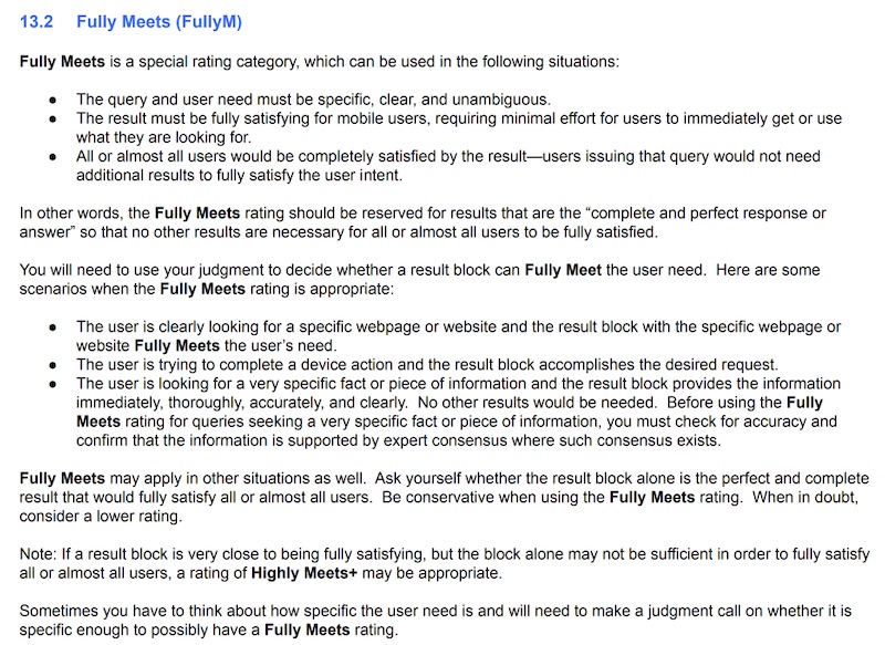 コンテンツが検索者のニーズを完全に満たすものと見なされるためには、「完全で完全な応答または回答である必要があります。これにより、すべてまたはほとんどすべてのユーザーが完全に満たされるために他の結果は必要ありません。満足し。" ページを評価するときは、上のスクリーンショットの3番目の箇条書きに細心の注意を払う必要があります。