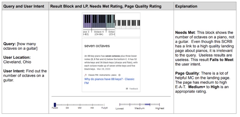 この例では、評価者にオクターブを説明する特定のページを表示するように指示しています。 クエリを考えずにページを見ると、ページ自体が良いように見えます。「ランディングページには役立つMC[メインコンテンツ]がたくさんあります。 このページには中程度から高いEATがあります。」
