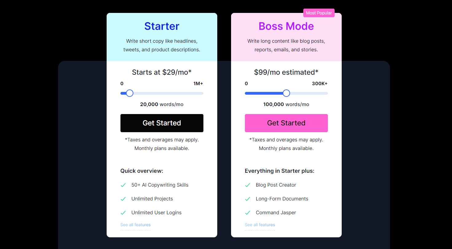‍ 高価- Jarvis が提供するクレジット ベースの価格モデルは、ユーザーがより多くのコンテンツを作成するには、より多くの料金を支払う必要があることを意味します。 基本プランは手頃な価格ですが、無制限の単語にアクセスするには月額$ 109を支払う必要があります. 特に予算が限られている場合、これは非常に高価になる可能性があります。