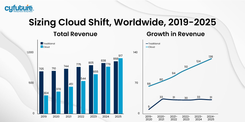 Gartner에 따르면 기존 IT에 대한 투자가 계속해서 클라우드 서비스에 대한 지출을 초과하고 있습니다. 그럼에도 불구하고 2019~2025년에 대한 예측에 따르면 해당 연도에는 기존 IUT 지출이 결국 클라우드 투자보다 뒤처지겠지만 클라우드 기반 지출은 계속 증가할 것입니다.