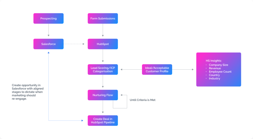 차트에서 논의할 핵심 영역은 다음과 같습니다. HubSpot 거래와 Salesforce 기회 사이의 파란색 선과 HubSpot 내 리드 스코어링 작업. 이러한 기준은 연락처/회사가 할당되고 후속적으로 참여하는 방법을 결정합니다.