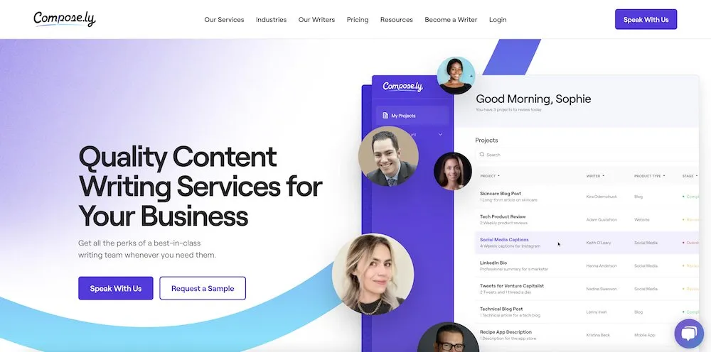 Compose.ly는 최고의 B2B 카피라이팅 서비스 목록에 있는 다음 카피라이팅 서비스입니다. 이 회사는 블로그 게시물, 기사, 보도 자료, 제품 설명 및 전자 책 작성을 포함한 B2B 고객 카피라이팅 서비스를 제공합니다.