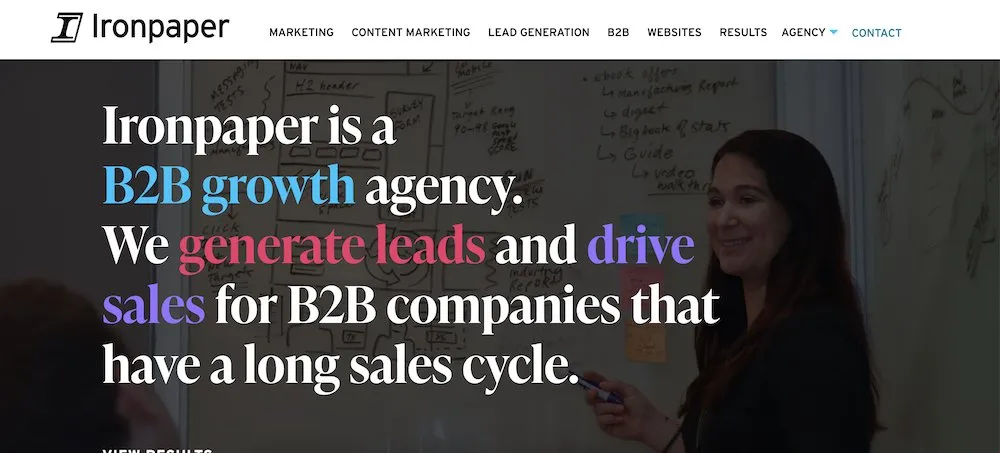 Ironpaper는 카피 라이팅 서비스를 제공하는 또 다른 전문 B2B 마케팅 대행사입니다. 그들은 업계에서 좋은 평판을 가지고 있으며 인상적인 고객 목록을 가지고 있습니다. 이것은 그들과 함께 작업하는 데 평균 시장 요율보다 높은 비용이 들지만 훌륭한 결과를 얻을 수 있음을 의미합니다.