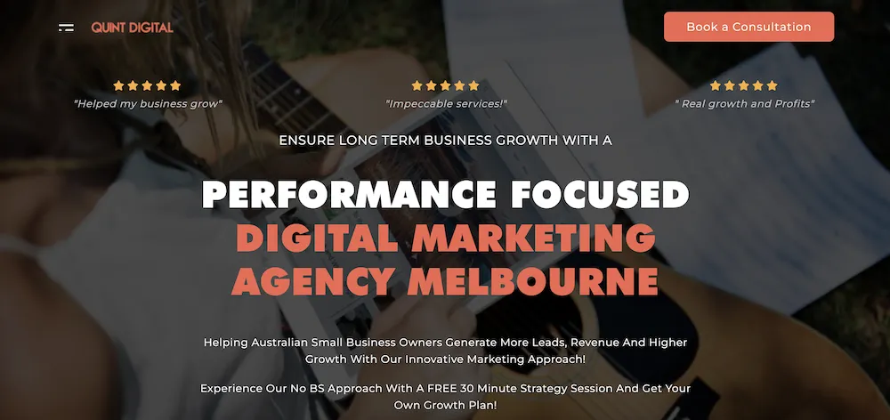 Quint Digital은 경쟁업체보다 앞서고 싶다면 탁월한 선택이 될 수 있습니다. 또한 신규 고객을 위한 무료 30분 전략 세션을 제공합니다. 따라서 이를 입증할 실적이 있는 최고 등급의 대행사를 찾고 있다면 오늘 Quint Digital에 연락하여 비즈니스가 잠재력을 달성하는 데 어떻게 도움이 되는지 알아보십시오.
