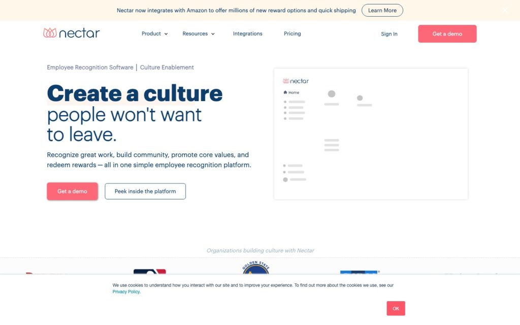 Nectar 는 긍정적인 직장 문화를 조성하고 회사 가치를 높이는 데 도움이 되는 직원 인식 소프트웨어 솔루션입니다. 하루 종일 소리를 지르거나 기프트 카드로 교환할 수 있는 포인트를 받을 수 있습니다.