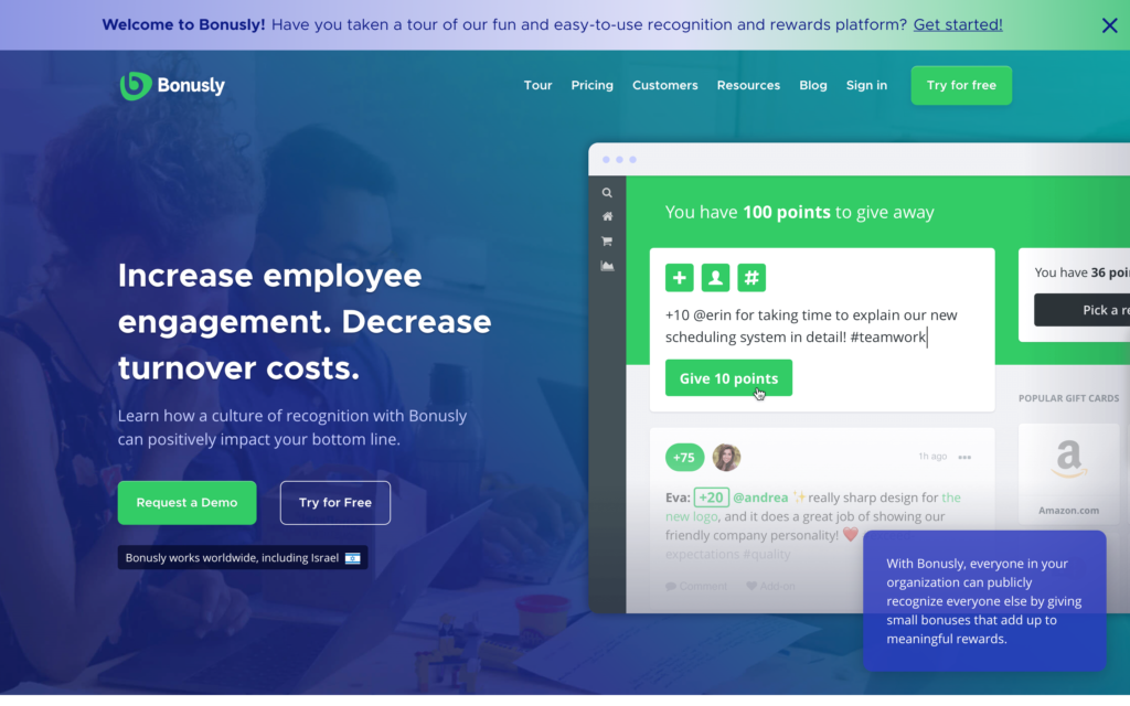 Bonusly는 전통적인 보상 및 표창 외에도 직원들이 동료에게 최고의 기프트 카드를 서로에게 보낼 수 있도록 합니다. 매월 각 직원은 기여에 대한 감사의 표시로 동료에게 소액의 보너스를 보내는 데 사용할 수 있는 수당을 받습니다.