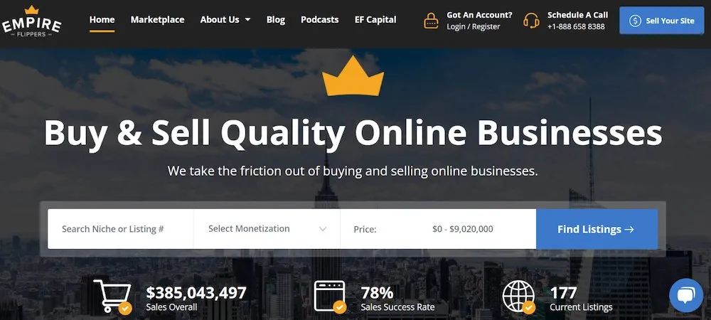 Empire Flippers는 블로그와 같은 디지털 자산의 매매를 용이하게 하는 또 다른 온라인 마켓플레이스입니다. 홈페이지에 접속하면 판매용 블로그를 검색할 수 있습니다. 예를 들어, 판매용 피트니스 블로그를 검색하면 수익 창출 방식(예: 제휴 수수료, 광고 등), 요구 가격 및 강조 표시된 정보와 함께 이 카테고리의 블로그 목록이 표시됩니다. 블로그의 월 수익.
