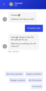 Intercom 사이트에서 사용 가능한 요금제를 검색하는 동안 이 메시지가 오른쪽 하단 모서리에도 나타납니다. 옵션 중 하나는 해당 페이지에 있기 때문에 논리적인 "계획 선택"입니다. 클릭하면 챗봇이 여러 옵션을 제공합니다.