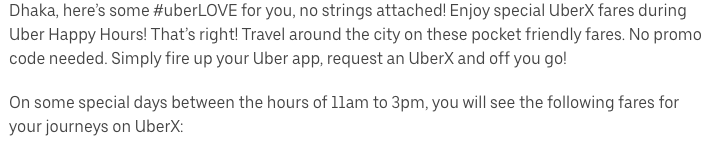 우버(Uber), 리프트(Lyft), 택시파이(Taxify), 캐비파이(Cabify)는 수요가 적을 때 가격을 낮추는 가격 모델인 '해피 아워(Happy Hour)'를 출시 하며 고객의 시선을 바꾸려 한다. 평균적으로 가격 인하 대 구형 모델은 모든 회사에서 10-50%입니다. 프로모션 규칙은 회사마다 다름