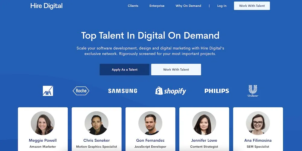 Hire Digital은 금융 전문 작가를 포함하여 인재를 소싱하는 플랫폼입니다. Hire Digital에는 플랫폼에 승인되기 전에 엄격한 심사 프로세스를 통과해야 하는 재무 작가 풀이 있습니다. 그런 다음 그들의 플랫폼은 귀하의 프로젝트에 가장 적합한 작가와 귀하를 연결합니다. Hire Digital은 최고 중 최고를 고용한다고 주장하므로 예산이 충분하다면 이 플랫폼이 인재를 소싱하기에 좋은 곳이 될 수 있습니다.