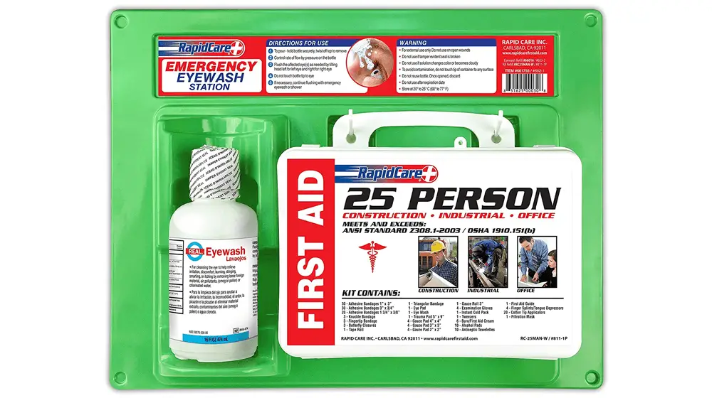 일부 산업에서는 눈 세척 스테이션이 필요합니다. 이 키트는 눈 세척에 대해 OSHA/ANSI 및 FDA를 준수하며 25인용 응급 처치 키트도 포함합니다. 눈 세척 키트에는 16온스 용량의 멸균 등장 완충 용액이 들어 있습니다.