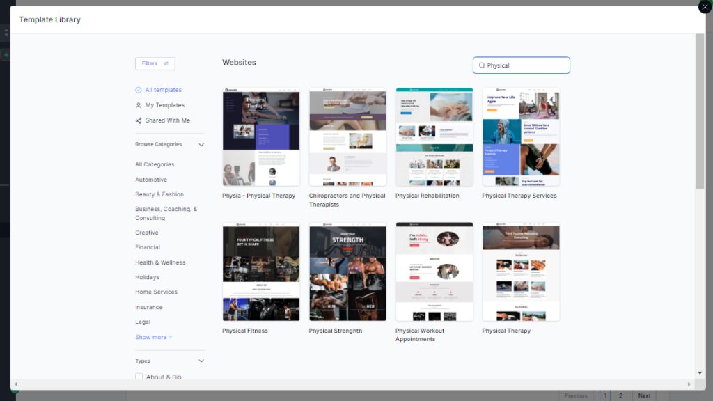 이렇게 하려면 "사이트" 탭으로 이동하여 "새 웹사이트" 옵션을 선택한 다음 "신체 재활" 템플릿을 선택하세요.