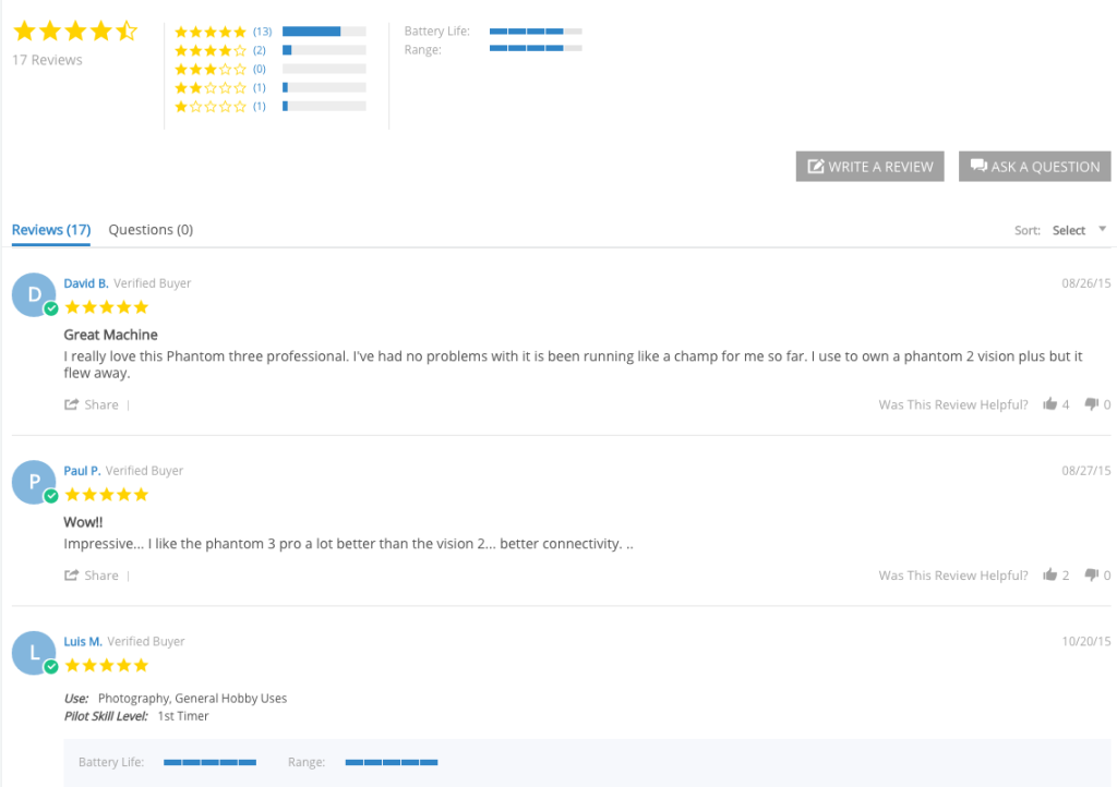 수많은 새로운 플레이어가 진입하는 매우 경쟁적인 공간에서 고객 피드백은 기업이 새로운 고객을 확보할 수 있도록 돕는 데 매우 중요합니다. 리뷰는 드론 회사가 트래픽을 유치하고 쇼핑객이 경쟁 제품보다 제품을 선택하도록 설득하는 데 필요한 사회적 증거를 제공합니다.
