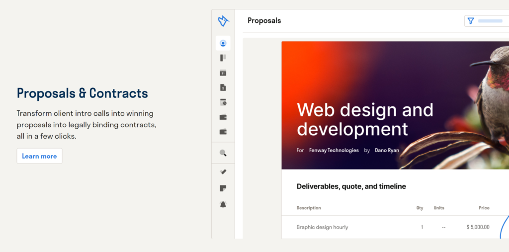 Bonsai 는 경쟁 제품과 동일한 프로젝트 관리 기능이 부족하더라도 프리랜서를 위한 완벽한 도구입니다. 그러나 놀라운 인터페이스, 템플릿 제안서, 계약서, 원클릭 송장 등은 중소기업과 기업가를 만족시키기에 충분합니다.