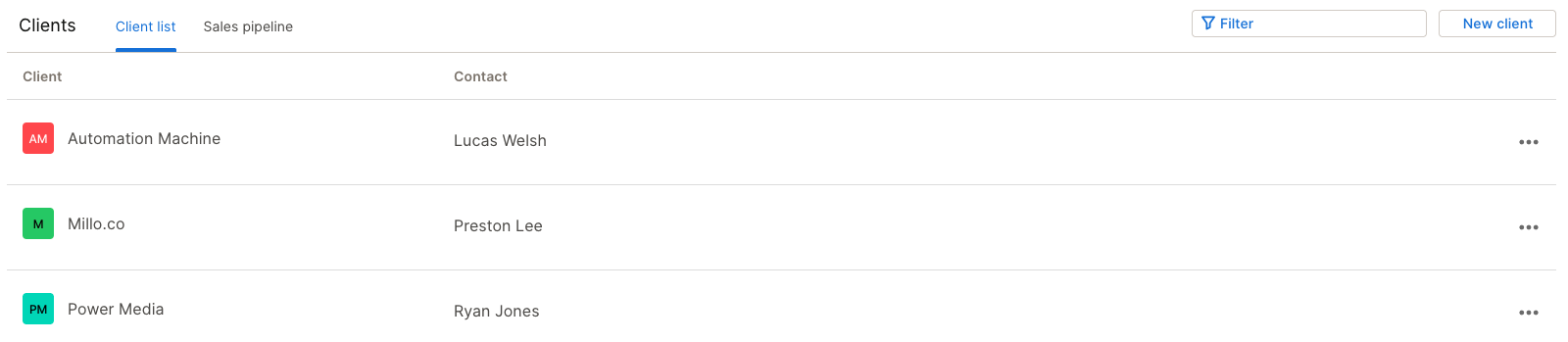 Hectic의 고객 관리 영역을 사용하면 한 곳에서 모든 내부 고객 정보를 추적할 수 있습니다. 각 클라이언트에는 마감일, 결과물 및 청구 금액이 포함된 개별 페이지가 있습니다. 또한 시간을 계획하는 데 매우 유용한 시각적 대역폭 프로젝션이 있습니다.