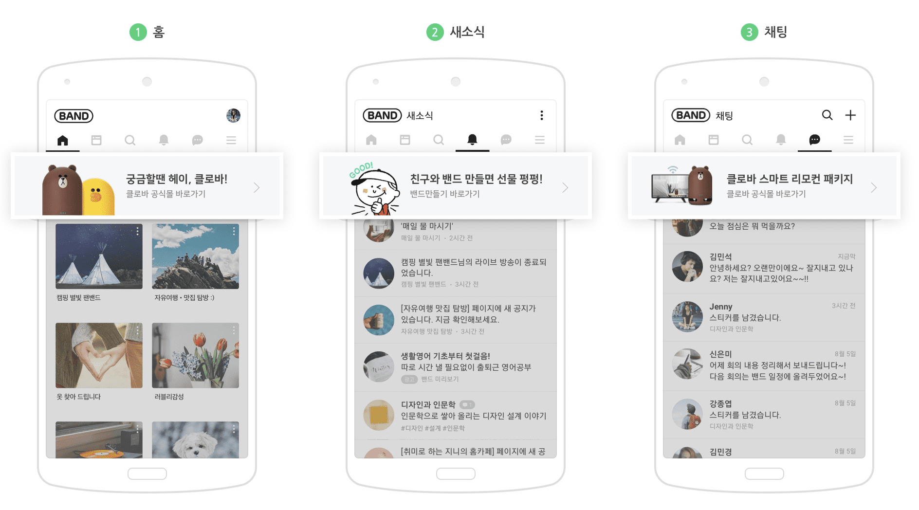 밴드 앱 홈, 뉴스, 배너가 채팅 상단에 노출됩니다. 프리미엄 위치에서 비즈니스 메시지 전달