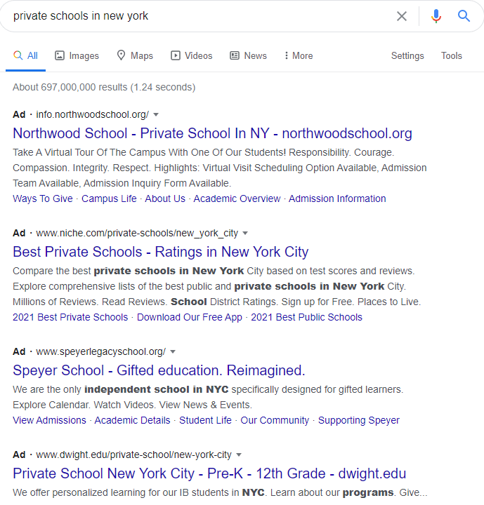 유료 광고가 있는 경우 특정 검색에 대한 광고가 SERP의 상단과 하단에 표시되고 자연 검색 결과는 세 개의 유료 광고 바로 아래 또는 페이지 상단에 표시됩니다.