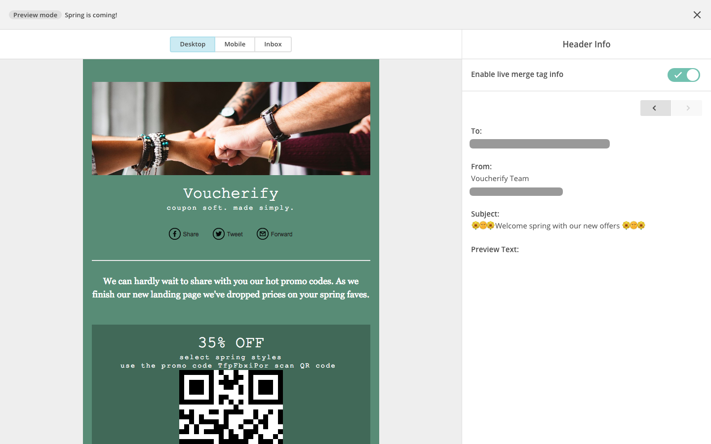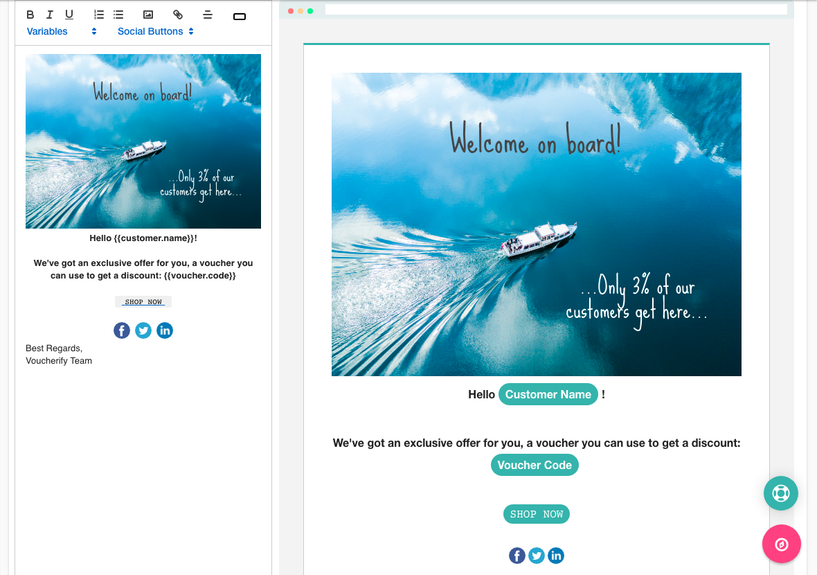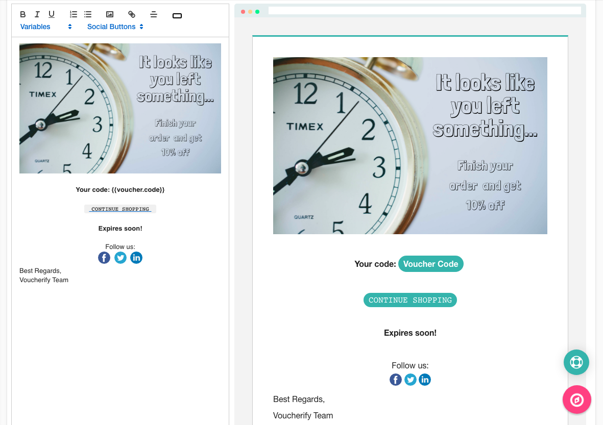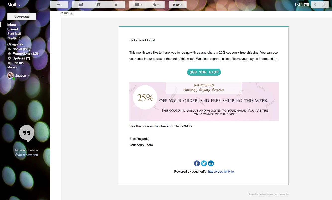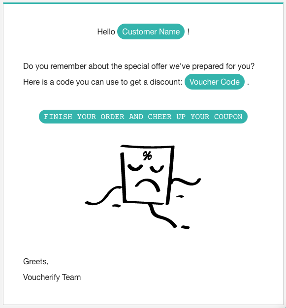 이미 WooCommerce용 MailChimp 플러그인을 사용하여 후속 조치를 만들고 있다면 개인화된 쿠폰으로 쉽게 개선할 수 있습니다. Voucherify와 같은 플랫폼은 WooCommerce 및 MailChimp와 무료로 통합되어 언급된 모든 프로모션 유형으로 이메일 마케팅을 제공합니다. MailChimp 템플릿에서 고객을 추적하고, 개인화된 쿠폰 캠페인을 생성하고, 최종 고객에게 전달할 수 있습니다.