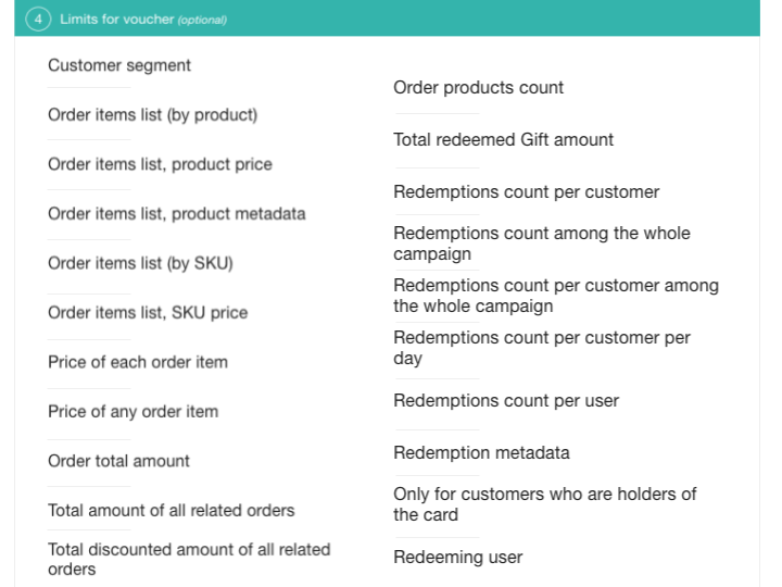 - 프로모션 관리 시스템(Voucherify 대시보드)을 사용하여 사용 제한. 차이점은 언뜻보기에 보입니다.