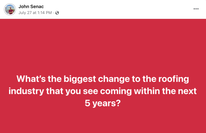 게시 됨: 2023-08-05John Senac(일명 John The Roof Pro) – 최근 페이스북을 방문하여 거대한 루퍼 청중에게 현재 지붕 산업의 추세와 예측으로 보는 것이 무엇인지 질문했습니다.