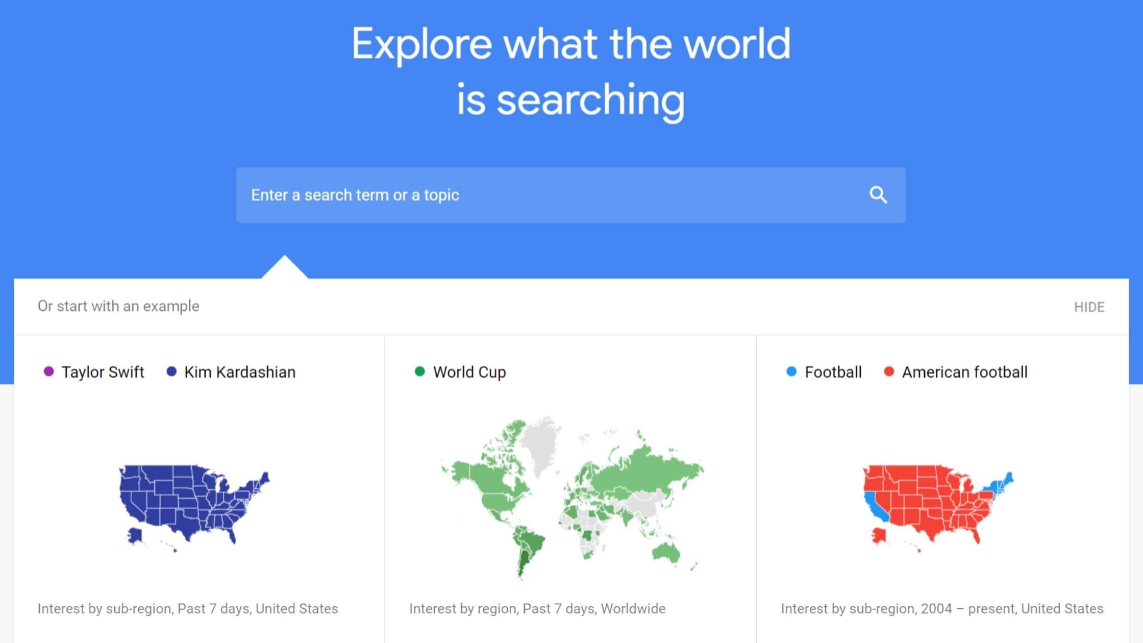 Google 트렌드 는 모든 틈새 시장에서 트렌드가 무엇인지 알아낼 수 있는 훌륭한(무료) 도구입니다. 관심 볼륨, 관련 주제 및 쿼리를 보여줍니다. 두 용어를 비교하여 어떤 용어가 더 인기가 있는지 확인할 수도 있습니다. 카테고리 및 위치별로 정렬하여 현재 핫한 항목을 확인할 수도 있습니다.