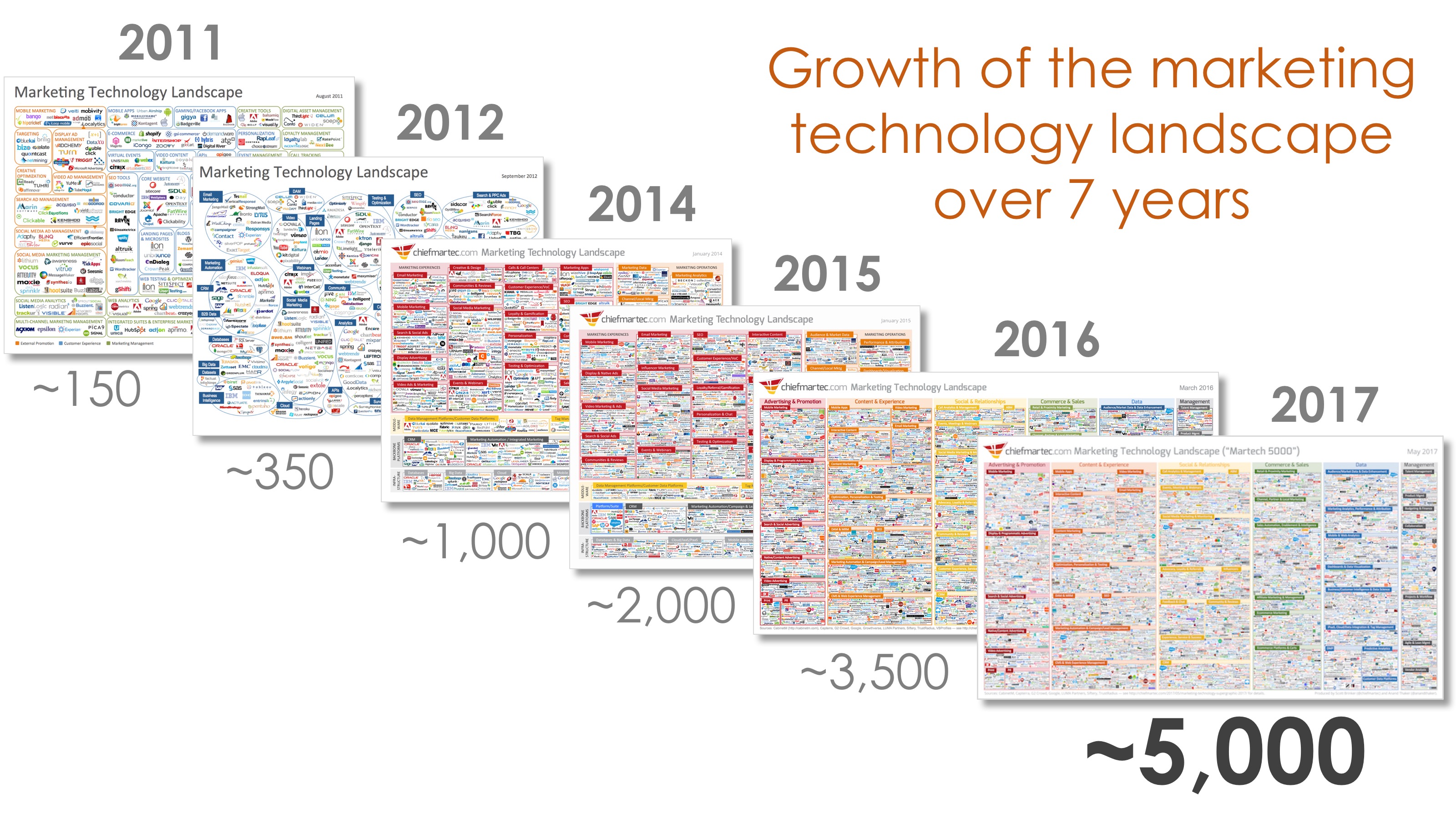 이미 고전적인 차트인 이 차트는 시장에 얼마나 많은 마케팅 기술 제공업체가 있는지 보여줍니다. Scott은 최근 몇 년 동안 몇 가지 통합 노력을 발견했지만 업계는 여전히 확장되고 있습니다.