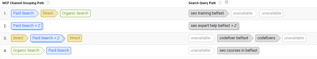 MCF 채널 그룹화 경로 필터를 사용하여 예를 들어 사용자가 디스플레이 광고 및 검색 광고와 상호작용한 전환에 대한 결과를 표시할 수도 있습니다. 이것은 아래 이미지에서 볼 수 있습니다.