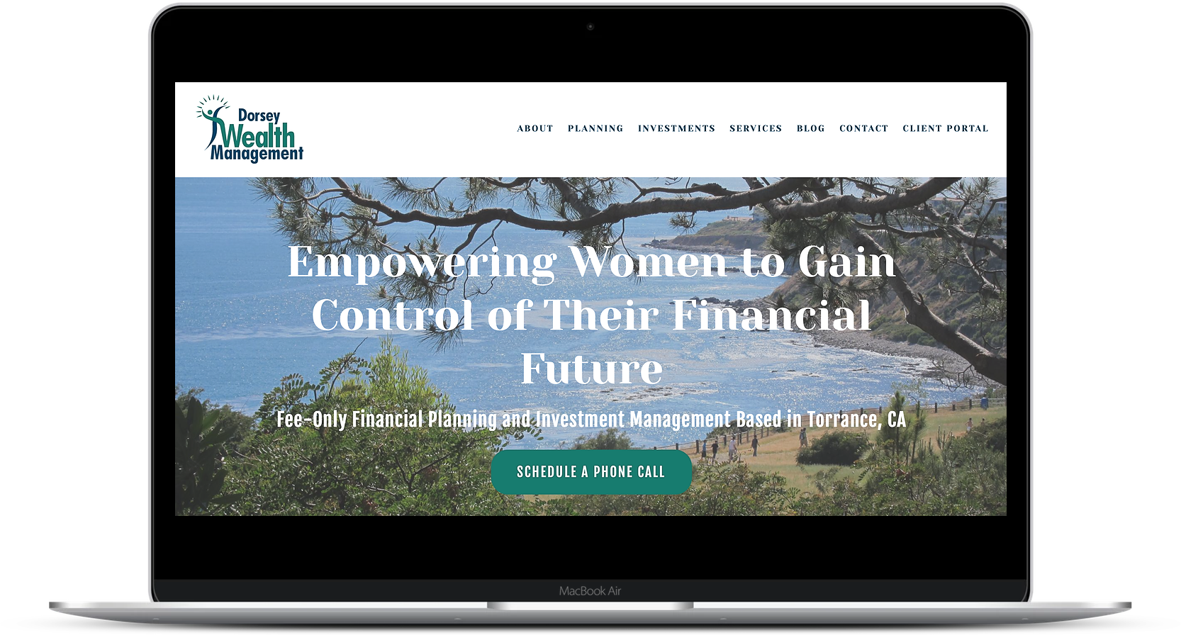 Wezwania do działania mają na celu przyciągnięcie uwagi widzów, dlatego należy je umieszczać w oczywistej części witryny lub treści . Umieszczenie przycisku CTA na stronie głównej witryny może być świetnym sposobem na przyciągnięcie czyjejś uwagi od samego początku. W poniższym przykładzie klient Twenty Over Ten, Dorsey Wealth Management , ponownie umieszcza swoje główne wezwanie do działania w górnej części strony, aby „zaplanować rozmowę telefoniczną”.