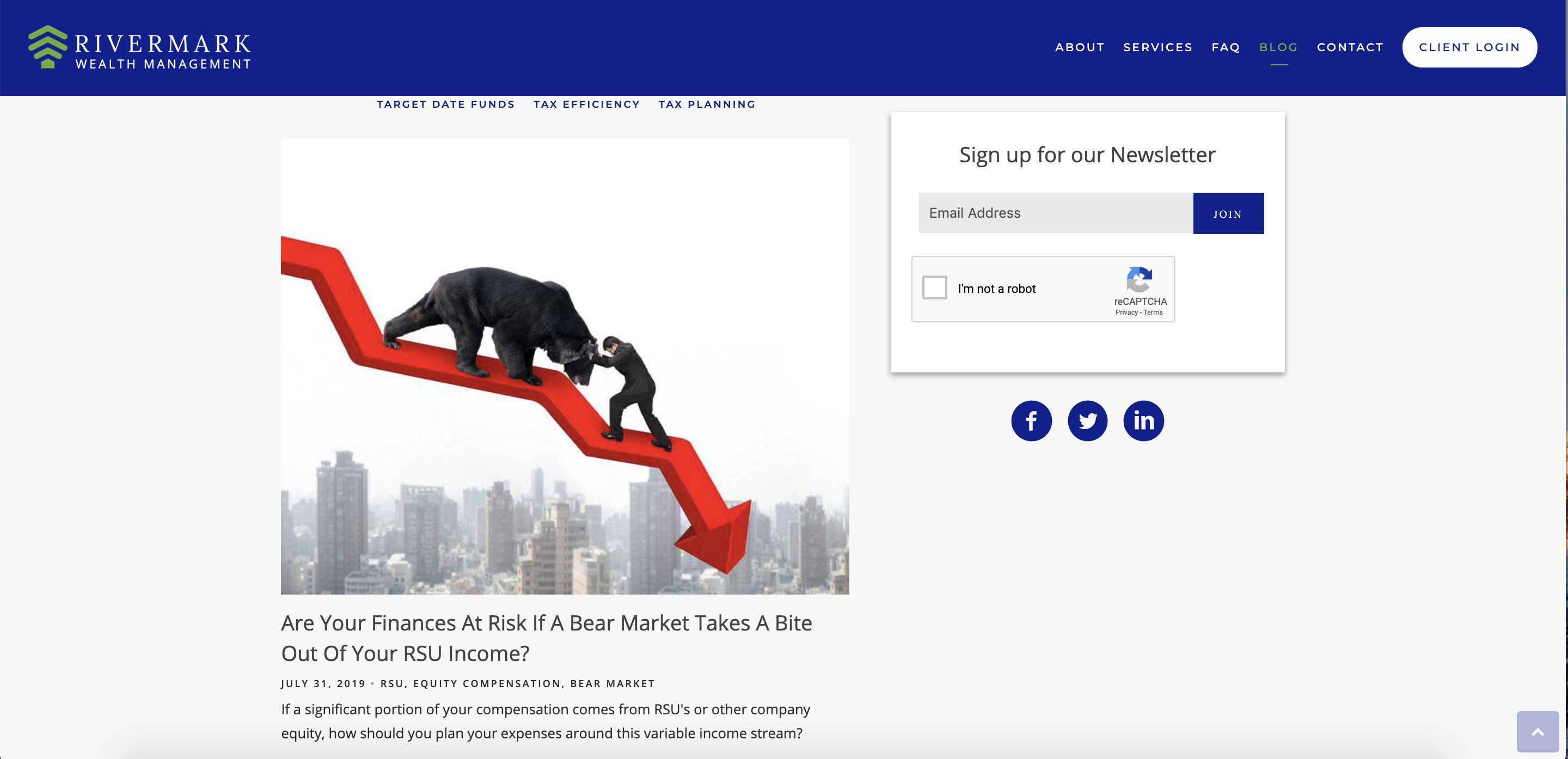 Klient Twenty Over Ten, Rivermark Wealth Management, prowadzi aktualizowany blog ze słowami kluczowymi i linkami. Mają też swój biuletyn zapisany na swoim blogu, co jest kolejną świetną taktyką, aby uzyskać więcej treści przed potencjalnymi klientami i przekształcić ich w klientów.