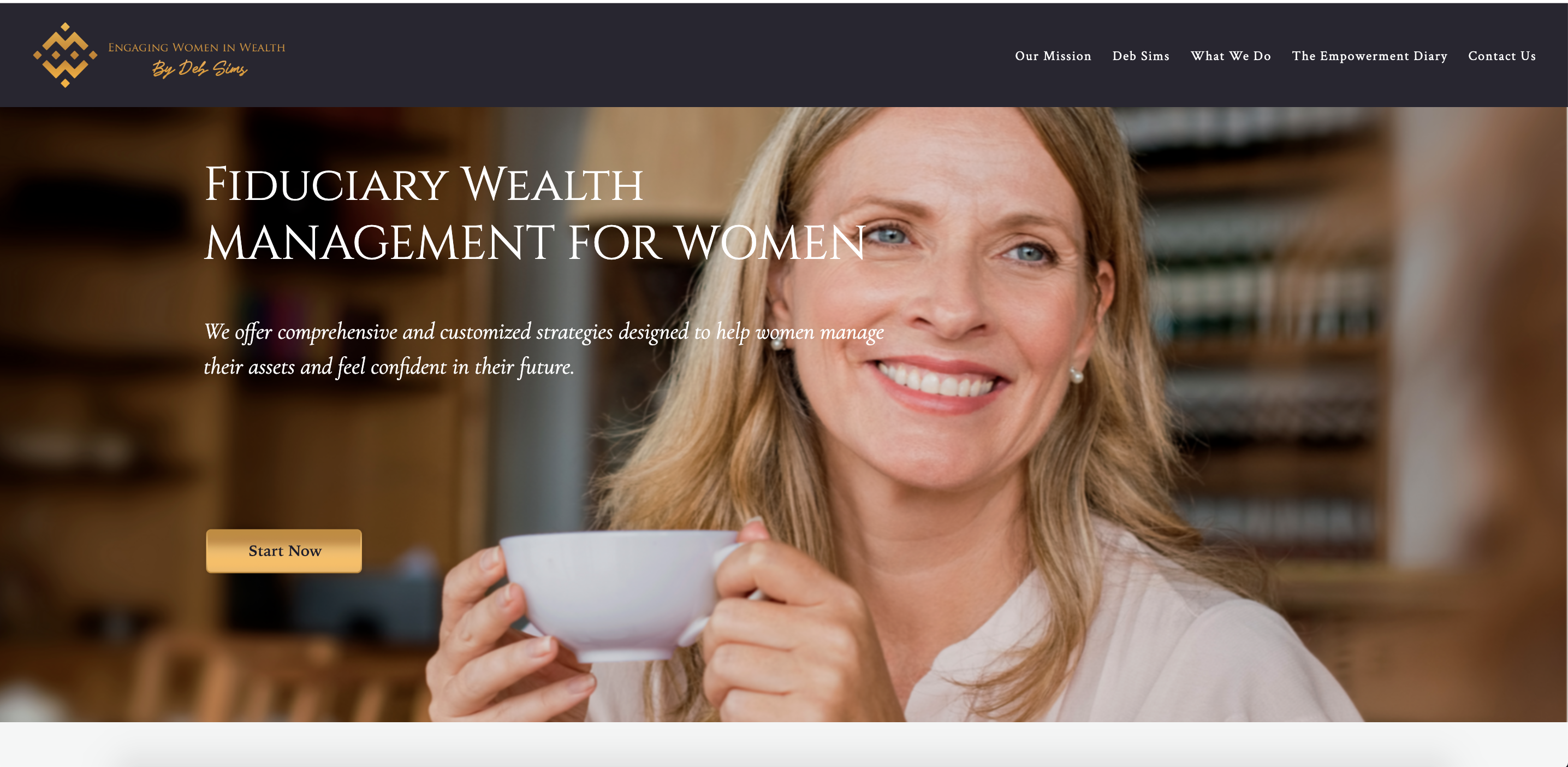 W poniższym przykładzie klientka firmy Twenty Over Ten Engaging Women in Wealth, od momentu wejścia na ich stronę główną, wyjaśnia, kim jest ich nisza, mówiąc: „Oferujemy kompleksowe i spersonalizowane strategie, które mają pomóc kobietom zarządzać ich aktywami i czuć się pewnie w swoich przyszły".