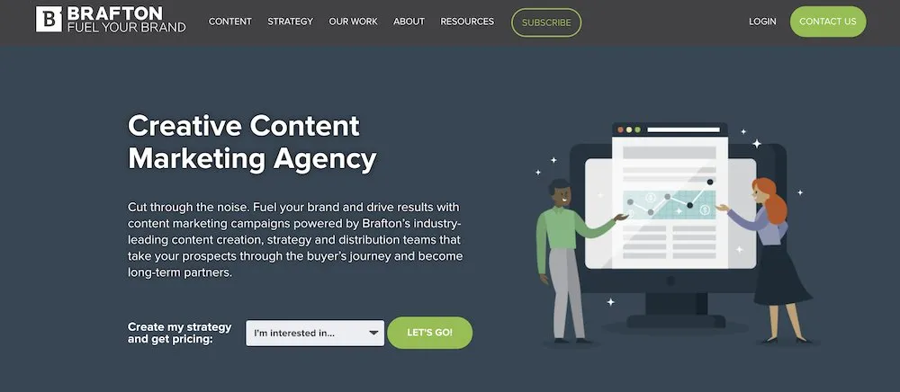 Brafton to agencja zajmująca się marketingiem treści, która współpracuje z klientami przy opracowywaniu, wdrażaniu i monitorowaniu strategii marketingu cyfrowego. Jedną ze strategii marketingowych, które tworzą dla klientów, jest marketing blogowy. Aby nawiązać współpracę z firmą, musisz wejść na jej stronę internetową i wypełnić ankietę opisującą Twoje potrzeby marketingowe. Jeden z menedżerów klienta skontaktuje się z Tobą w celu omówienia potrzebnych usług. Jeśli jesteś zadowolony z ich planu, zachęcą ich autorów do tworzenia dla Ciebie postów na blogu.