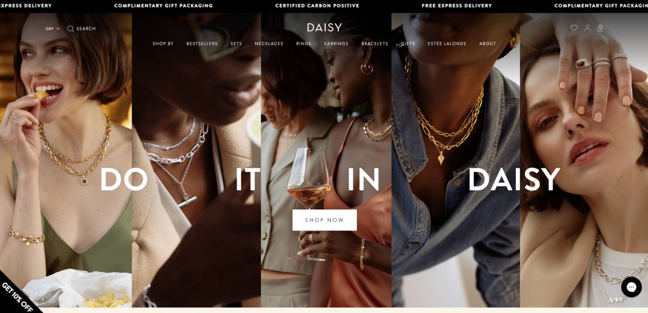Ta strona wyróżnia się spośród wielu innych dzięki różowo-zielonej neonowej kolorystyce, która wykracza poza zwykłą estetykę większości sklepów jubilerskich na Shopify. Czy to działa? Są wystarczająco bystrzy, aby podkreślić, że mieli wzmianki w Elle, The Telegraph, Hello!, Cosmopolitan, Marie Claire, Stylist i Grazia, więc wygląda na to, że tak!