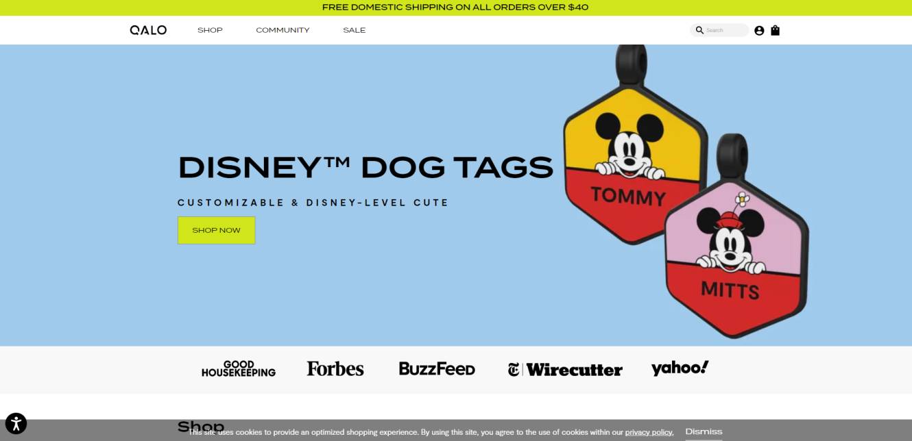 Przejrzysta, oparta na siatce witryna wita gościa w sklepie Qalo Shopify, podkreślając bezpłatną wysyłkę, społeczny dowód słuszności poprzez wzmianki w mediach i recenzje klientów. To zabawnie wyglądający, przystępny cenowo sklep z akcesoriami i biżuterią z asortymentem obejmującym współpracę z Disneyem i Gwiezdnymi Wojnami.
