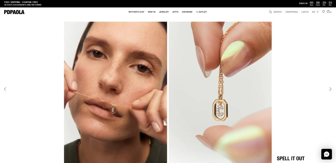 Ten sklep jubilerski jest na platformie Shopify Plus. Górny baner ma odliczanie, pokazujące, ile czasu pozostało do złożenia zamówienia, jeśli chcesz skorzystać z bezpłatnej wysyłki (chociaż niektórzy twierdzą, że włączenie bezpłatnej wysyłki jako standardu mogłoby być lepszym rozwiązaniem dla współczynników konwersji, z zastosowanym banerem odliczania zaszczepić poczucie pilności za pomocą innego wskaźnika).