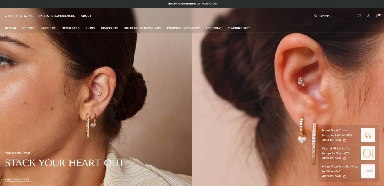 W chwili pisania tego tekstu baner bohatera strony głównej sklepu Shopify Plus Astrid i Miyu jest podzielony na pół: po lewej stronie jest ujęcie kobiety noszącej kilka kolczyków marki, a po prawej krótkie, powtarzające się wideo pokazujące zbliżenie jej ucha i produktów. To świetny sposób na przedstawienie marki i tchnięcie życia w jej produkty.